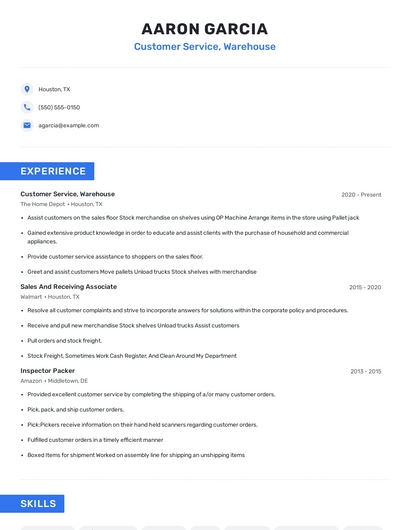 Build a professional customer service, warehouse resume in minutes. Browse through our resume examples to identify the best way to word your resume. Then choose from 5+ resume templates to create your customer service, warehouse resume.