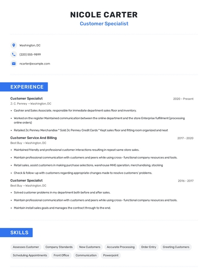Build a professional customer specialist resume in minutes. Browse through our resume examples to identify the best way to word your resume. Then choose from 5+ resume templates to create your customer specialist resume.
