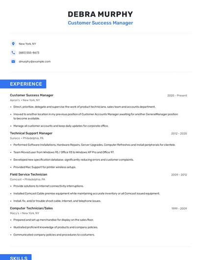 Build a professional customer success manager resume in minutes. Browse through our resume examples to identify the best way to word your resume. Then choose from 5+ resume templates to create your customer success manager resume.