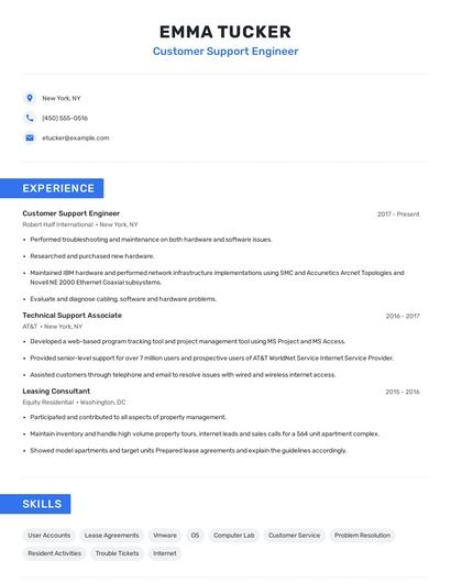 Build a professional customer support engineer resume in minutes. Browse through our resume examples to identify the best way to word your resume. Then choose from 5+ resume templates to create your customer support engineer resume.