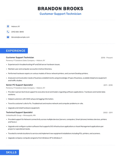 Build a professional customer support technician resume in minutes. Our AI resume writing assistant will guide you through every step of the process, and you can choose from 10+ resume templates to create your customer support technician resume.7. Technical Support