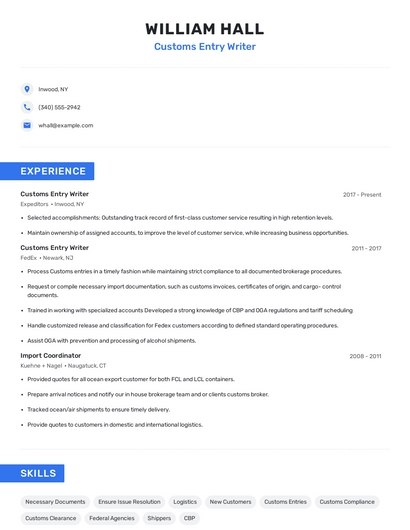 Build a professional customs entry writer resume in minutes. Browse through our resume examples to identify the best way to word your resume. Then choose from 5+ resume templates to create your customs entry writer resume.