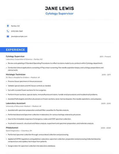 Build a professional cytology supervisor resume in minutes. Our AI resume writing assistant will guide you through every step of the process, and you can choose from 10+ resume templates to create your cytology supervisor resume.7. Microbiology