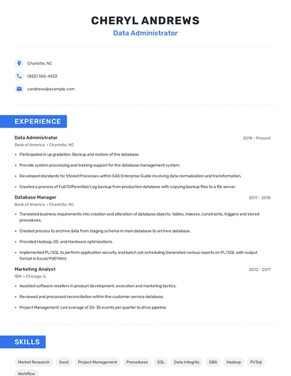 Build a professional data administrator resume in minutes. Browse through our resume examples to identify the best way to word your resume. Then choose from 5+ resume templates to create your data administrator resume.