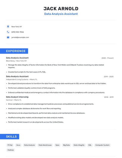 Build a professional data analysis assistant resume in minutes. Browse through our resume examples to identify the best way to word your resume. Then choose from 5+ resume templates to create your data analysis assistant resume.