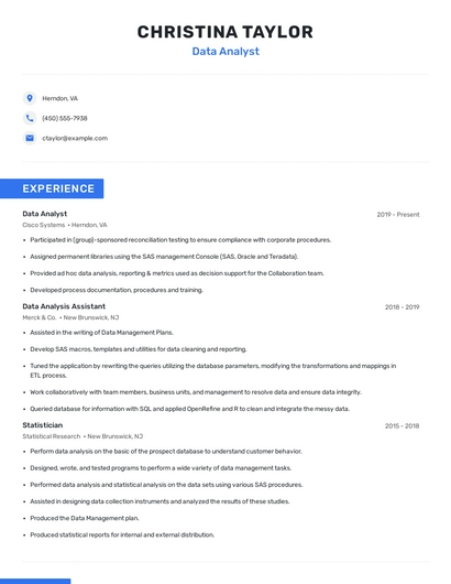 Build a professional data analyst resume in minutes. Browse through our resume examples to identify the best way to word your resume. Then choose from 5+ resume templates to create your data analyst resume.