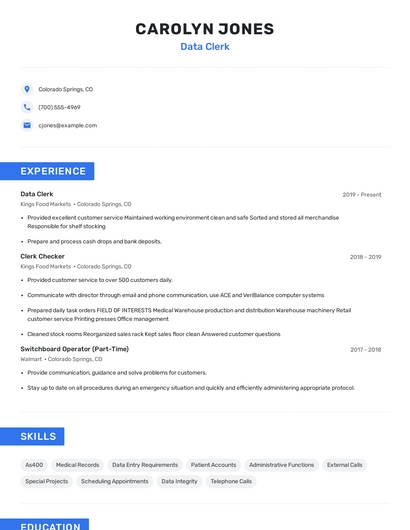 Build a professional data clerk resume in minutes. Browse through our resume examples to identify the best way to word your resume. Then choose from 5+ resume templates to create your data clerk resume.