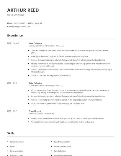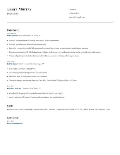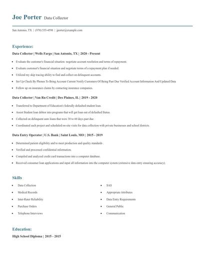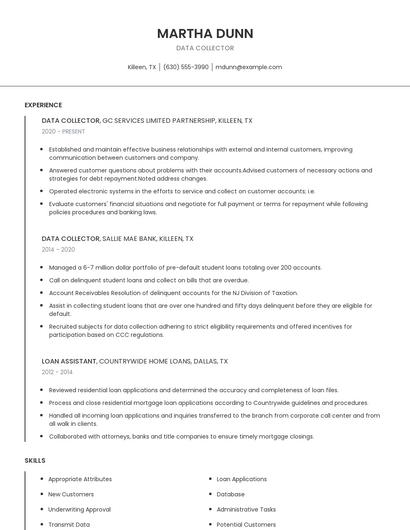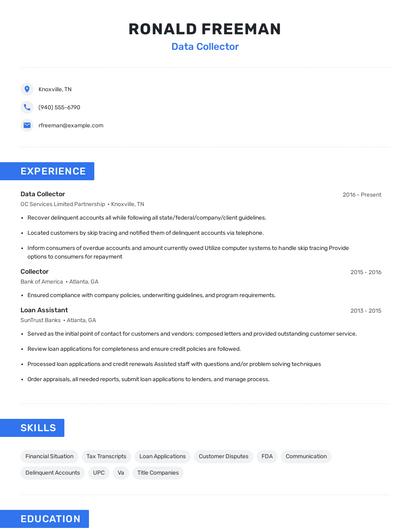 You can use Zippia's AI resume builder to make the resume writing process easier while also making sure that you include key information that hiring managers expect to see on a data collector resume. You'll find resume tips and examples of skills, responsibilities, and summaries, all provided by Zippi, your career sidekick.