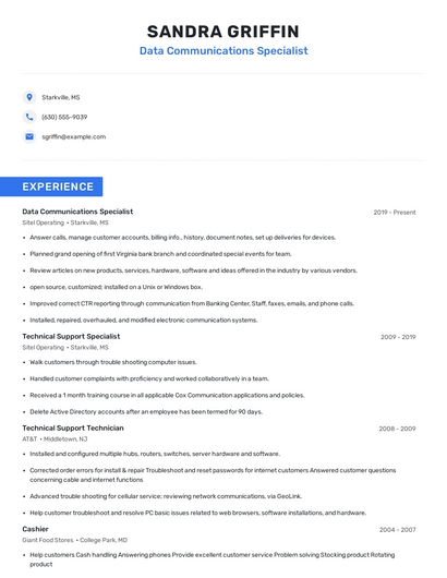 Build a professional data communications specialist resume in minutes. Browse through our resume examples to identify the best way to word your resume. Then choose from 5+ resume templates to create your data communications specialist resume.