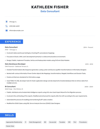 Build a professional data consultant resume in minutes. Browse through our resume examples to identify the best way to word your resume. Then choose from 5+ resume templates to create your data consultant resume.