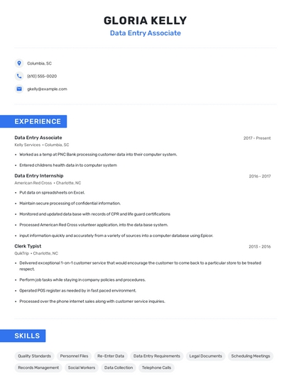 Build a professional data entry associate resume in minutes. Browse through our resume examples to identify the best way to word your resume. Then choose from 5+ resume templates to create your data entry associate resume.