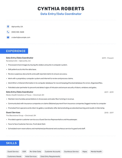 Build a professional data entry/data coordinator resume in minutes. Browse through our resume examples to identify the best way to word your resume. Then choose from 5+ resume templates to create your data entry/data coordinator resume.