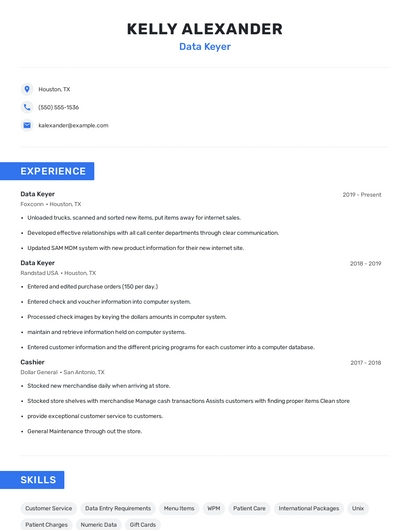 Build a professional data keyer resume in minutes. Browse through our resume examples to identify the best way to word your resume. Then choose from 5+ resume templates to create your data keyer resume.