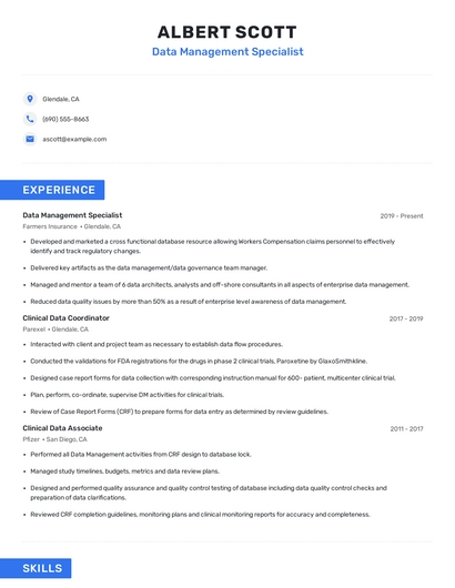 Build a professional data management specialist resume in minutes. Browse through our resume examples to identify the best way to word your resume. Then choose from 5+ resume templates to create your data management specialist resume.