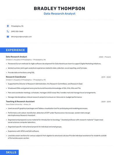 Build a professional data research analyst resume in minutes. Browse through our resume examples to identify the best way to word your resume. Then choose from 5+ resume templates to create your data research analyst resume.