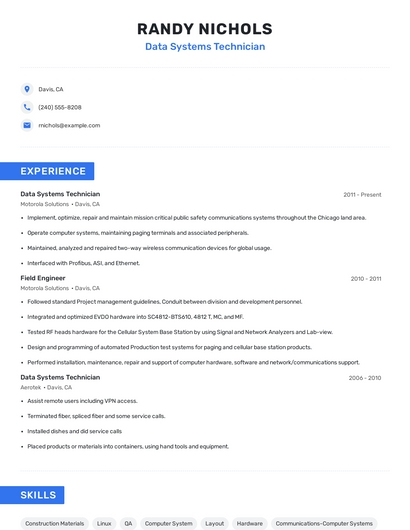 Build a professional data systems technician resume in minutes. Browse through our resume examples to identify the best way to word your resume. Then choose from 5+ resume templates to create your data systems technician resume.
