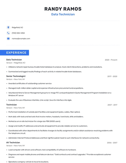 Build a professional data technician resume in minutes. Browse through our resume examples to identify the best way to word your resume. Then choose from 5+ resume templates to create your data technician resume.