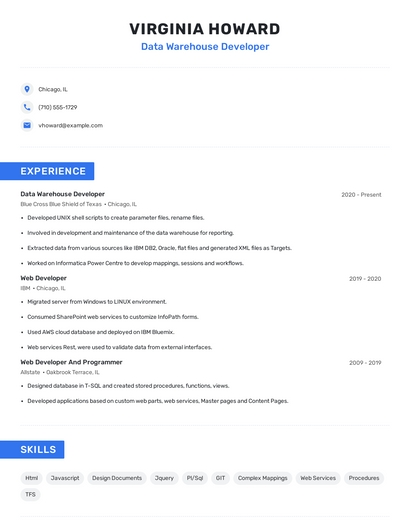 Build a professional data warehouse developer resume in minutes. Browse through our resume examples to identify the best way to word your resume. Then choose from 5+ resume templates to create your data warehouse developer resume.