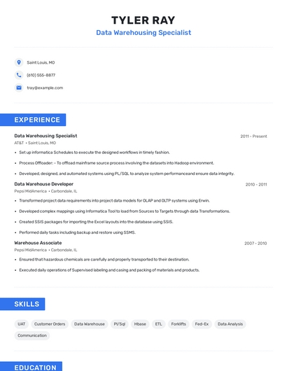 Build a professional data warehousing specialist resume in minutes. Browse through our resume examples to identify the best way to word your resume. Then choose from 5+ resume templates to create your data warehousing specialist resume.