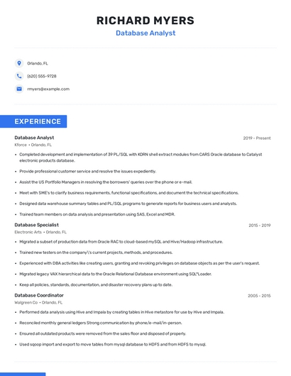Build a professional database analyst resume in minutes. Browse through our resume examples to identify the best way to word your resume. Then choose from 5+ resume templates to create your database analyst resume.