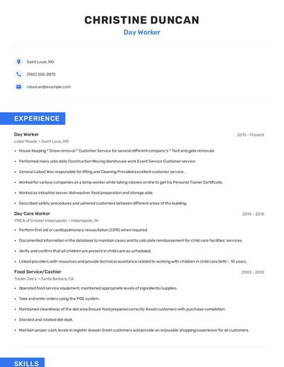 Build a professional day worker resume in minutes. Our AI resume writing assistant will guide you through every step of the process, and you can choose from 10+ resume templates to create your day worker resume.7. Child Care