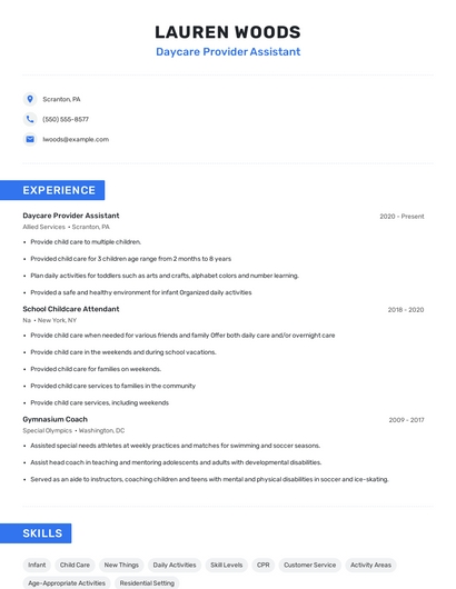 Build a professional daycare provider assistant resume in minutes. Browse through our resume examples to identify the best way to word your resume. Then choose from 5+ resume templates to create your daycare provider assistant resume.