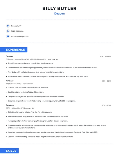 Build a professional deacon resume in minutes. Our AI resume writing assistant will guide you through every step of the process, and you can choose from 10+ resume templates to create your deacon resume.What skills help Deacons find jobs?