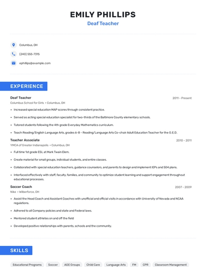 Build a professional deaf teacher resume in minutes. Browse through our resume examples to identify the best way to word your resume. Then choose from 5+ resume templates to create your deaf teacher resume.