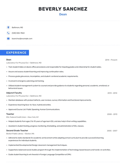 Build a professional dean resume in minutes. Browse through our resume examples to identify the best way to word your resume. Then choose from 5+ resume templates to create your dean resume.