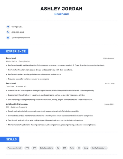 Build a professional deckhand resume in minutes. Browse through our resume examples to identify the best way to word your resume. Then choose from 5+ resume templates to create your deckhand resume.