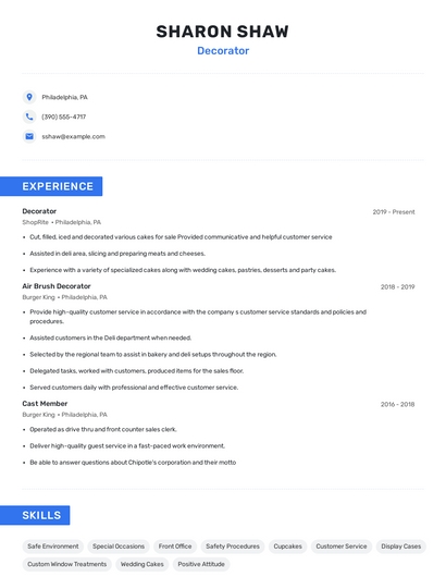 Build a professional decorator resume in minutes. Our AI resume writing assistant will guide you through every step of the process, and you can choose from 10+ resume templates to create your decorator resume.7. Store Sales