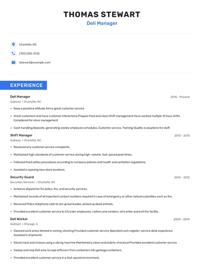 Build a professional deli manager resume in minutes. Browse through our resume examples to identify the best way to word your resume. Then choose from 5+ resume templates to create your deli manager resume.
