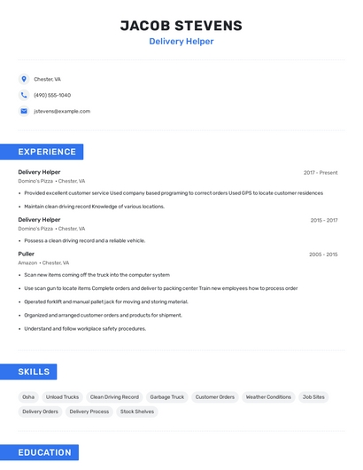 Build a professional delivery helper resume in minutes. Browse through our resume examples to identify the best way to word your resume. Then choose from 5+ resume templates to create your delivery helper resume.