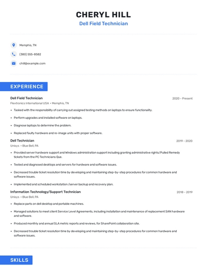 Build a professional dell field technician resume in minutes. Browse through our resume examples to identify the best way to word your resume. Then choose from 5+ resume templates to create your dell field technician resume.