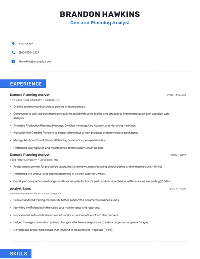 Build a professional demand planning analyst resume in minutes. Browse through our resume examples to identify the best way to word your resume. Then choose from 5+ resume templates to create your demand planning analyst resume.