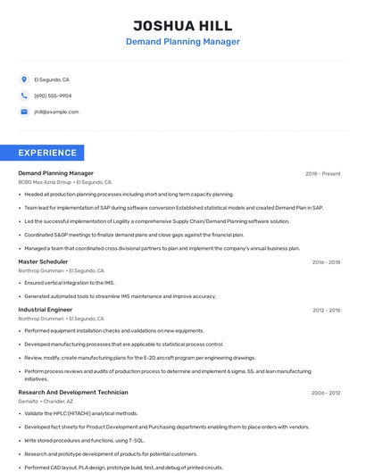 Build a professional demand planning manager resume in minutes. Browse through our resume examples to identify the best way to word your resume. Then choose from 5+ resume templates to create your demand planning manager resume.