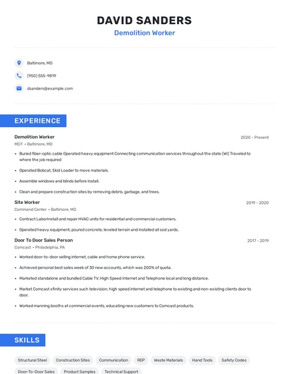 Build a professional demolition worker resume in minutes. Browse through our resume examples to identify the best way to word your resume. Then choose from 5+ resume templates to create your demolition worker resume.