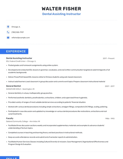 Build a professional dental assisting instructor resume in minutes. Browse through our resume examples to identify the best way to word your resume. Then choose from 5+ resume templates to create your dental assisting instructor resume.