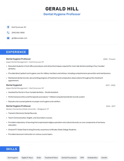 Build a professional dental hygiene professor resume in minutes. Browse through our resume examples to identify the best way to word your resume. Then choose from 5+ resume templates to create your dental hygiene professor resume.
