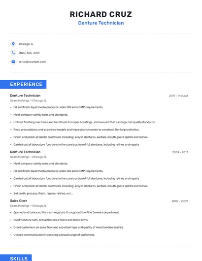 Build a professional denture technician resume in minutes. Our AI resume writing assistant will guide you through every step of the process, and you can choose from 10+ resume templates to create your denture technician resume.7. Mouth Guards