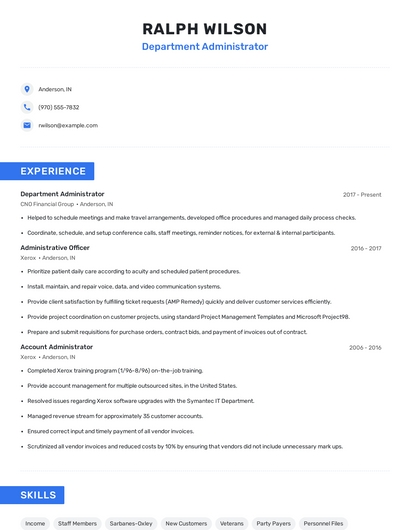 Build a professional department administrator resume in minutes. Browse through our resume examples to identify the best way to word your resume. Then choose from 5+ resume templates to create your department administrator resume.