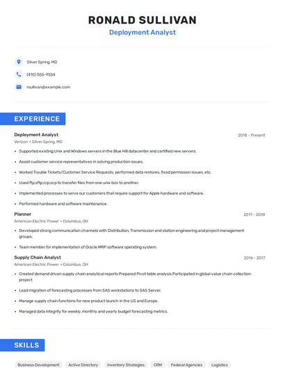 Build a professional deployment analyst resume in minutes. Browse through our resume examples to identify the best way to word your resume. Then choose from 5+ resume templates to create your deployment analyst resume.