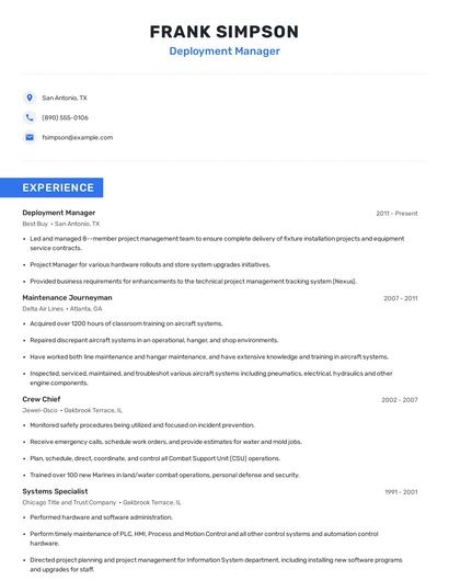 Build a professional deployment manager resume in minutes. Browse through our resume examples to identify the best way to word your resume. Then choose from 5+ resume templates to create your deployment manager resume.