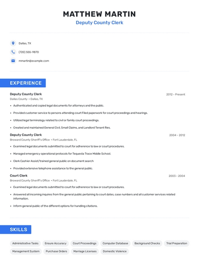 Build a professional deputy county clerk resume in minutes. Browse through our resume examples to identify the best way to word your resume. Then choose from 5+ resume templates to create your deputy county clerk resume.