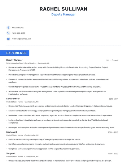Build a professional deputy manager resume in minutes. Browse through our resume examples to identify the best way to word your resume. Then choose from 5+ resume templates to create your deputy manager resume.