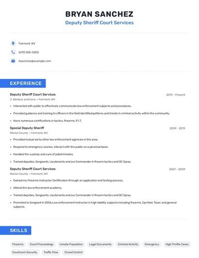Build a professional deputy sheriff court services resume in minutes. Our AI resume writing assistant will guide you through every step of the process, and you can choose from 10+ resume templates to create your deputy sheriff court services resume.What skills help Deputy Sheriffs Court Services find jobs?