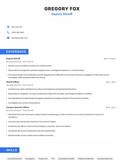 Build a professional deputy sheriff resume in minutes. Browse through our resume examples to identify the best way to word your resume. Then choose from 5+ resume templates to create your deputy sheriff resume.