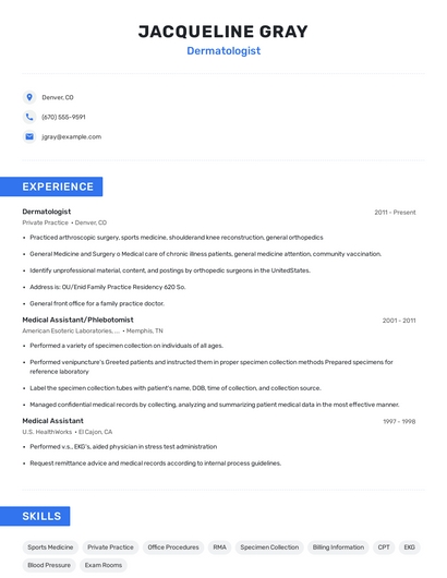 Build a professional dermatologist resume in minutes. Browse through our resume examples to identify the best way to word your resume. Then choose from 5+ resume templates to create your dermatologist resume.