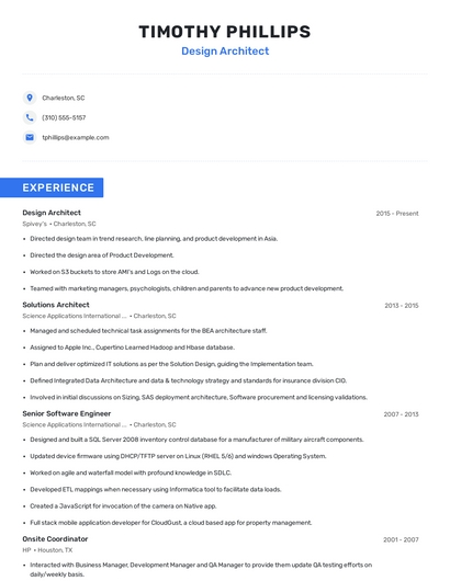 Build a professional design architect resume in minutes. Browse through our resume examples to identify the best way to word your resume. Then choose from 5+ resume templates to create your design architect resume.