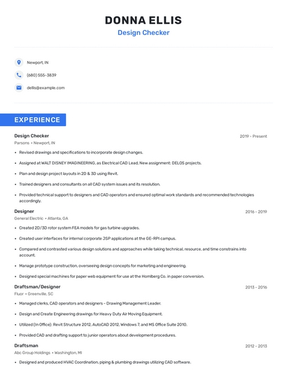Build a professional design checker resume in minutes. Browse through our resume examples to identify the best way to word your resume. Then choose from 5+ resume templates to create your design checker resume.